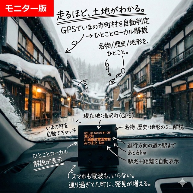 ※税込価格表示に変更しました。 =========================== 現在こちらのモニター版のみの販売となります。どなたでも購入いただけます。※ 正式版(通常版)は未発売/発売時期未定 です。 ※本ページの内容をよく読んでご注文いただけますと幸いです。 【モニター版について】 =========================== 表示・挙動などに改善余地や軽微な不具合が残る可能性があります。 製造上の都合により、3Dプリント特有の積層痕や歪み・しわが見られる場合があります。 ご了承のうえご購入ください。数量限定で通常価格よりお得にご提供しています。 ■フィードバックのお願い(任意) ・使用後レポート:1回(短文でOK/購入から1ヶ月以内目安) 内容:良かった点・困った点・改善アイデア(各1〜3行) ・不具合が出た場合:気づいた範囲でご連絡ください 例:日時/走行中 or 停車中/症状/再現性 ■モニター版の保証・修理対応 必要に応じて、返送での調整(修理)をご相談する場合があります。 ・購入後2ヶ月以内:最大2回まで無償で調整対応(通常使用での不具合・バグ含む) ・返送時送料:当方への返送(お客様→当方)はお客様負担、調整後の返送(当方→お客様)は当方負担となります。 =========================== 注意事項 =========================== ①表示位置は各市町村の中心部(役場など)からの距離をもとに算出しているため、市町村の境界で正確に切り替わるものではありません。若干ずれます。 ②夏場の車内(直射日光下)では高温によりケース(PETG)が変形する可能性があるため、ダッシュボード放置を避け、日陰保管や遮熱などの対策をお願いします。 ※商品画像はイメージ画像です。文字色は白になります。 =========================== KOTANOSUKE WORKS(こたのすけワークス)について =========================== 「旅の途中が、いちばん面白い。」をつくる小さな工房です。 GLG-01は、ドライブや車中泊の“移動時間”を、ちょっと楽しい体験に変えるためのGPSローカル旅ガイド端末です。 レビュー動画: 【車中泊Youtuber「青森の小野さん」】 https://youtu.be/7euzxMA7XQs 【旅Youtuber「ばもさん」】 ■実機使用レビュー https://www.youtube.com/watch?v=E0Q-vIOE-hc&t=4s ■(対談)ファーストインプレッション https://youtube.com/shorts/zVL23_Ju7Ik ■(対談)なぜこれで旅が豊かになるか https://www.youtube.com/shorts/xhnMMHmEvz8 【GLG-01の主な機能】 =========================== 1) 走ってるだけで「いまの町」がわかる =========================== 運転しているだけで、現在地の市町村を自動判定。 その土地の 名物・観光・歴史・地形 などを「ひとこと」で表示します。 知らない道でも、“地元トリビア”が勝手に増えていく感覚を味わえます。 【新機能!自動スクロール機能搭載】 3つの自動スクロール機能を新しく搭載しました。 ①通常モード:下ボタン長押しで2周自動スクロール ②新エリアスクロールモード:新しい地域に入ると自動で5分間スクロール ③常時スクロールモード:常時自動スクロール =========================== 2) 「寄れる道の駅」が自然に見えてくる =========================== 全国約1200の道の駅データを内蔵。 進行方向 ±60° の範囲にある道の駅だけを賢く絞り込み、画面下に 駅名+距離 を表示します。 停車中は最寄りの道の駅表示に切り替わるので、休憩や寄り道の判断がラクになります。 さらに、画面を下にスクロールすると近隣の道の駅5件も確認できます。 =========================== 3) 旅が“記録”として残る(あとから楽しい) =========================== いつ・どこを走ったか、どの市町村に入ったか、道の駅に立ち寄ったか。 GLG-01が自動で履歴として残していきます。 「今日どこ通ったっけ?」を、あとから見返せる旅のログになります。 =========================== 4) 旅の終わりに、スマホでログ回収 → 地図で再現 =========================== 端末のWi-Fiにスマホ/PCから接続すると、専用ページにアクセスできます。 ・移動ルートのプレビュー ・都道府県の制覇状況グラフ ・期間指定でGPXダウンロード ダウンロードしたGPXをPCからGoogleマイマップ等に読み込めば、旅の軌跡が地図に戻ってきます。 ※Wi-Fiは UPボタン長押しで30分間ON になります。 =========================== 5) “お気に入り”と“制覇”で、旅がゲームになる =========================== 履歴の地域詳細画面で「決定」長押し → お気に入り登録。 さらに、訪問した 市町村数 / 道の駅数 を自動集計するので、 旅の成果が数字で見えて、次の旅のモチベーションになります。 =========================== 記録仕様(挙動の目安) =========================== 市町村:新しい市町村に入ったとき(中心地からの距離で判定 厳密な境界ではありません) 道の駅:2km以内に入り、その状態が5分以上 継続したとき 履歴(市町村・道の駅)各256件(古いものから上書き) GPX:速度10km/h以上で、60秒経過または200m移動のいずれかで記録 ※GPXは約21,000ポイントまで保存されます(目安:車移動中心で1日8時間走行した場合、約3,000ポイント程度) *制覇ログ、GPXデータは手動でリセットできません。 =========================== 製品情報 ========================